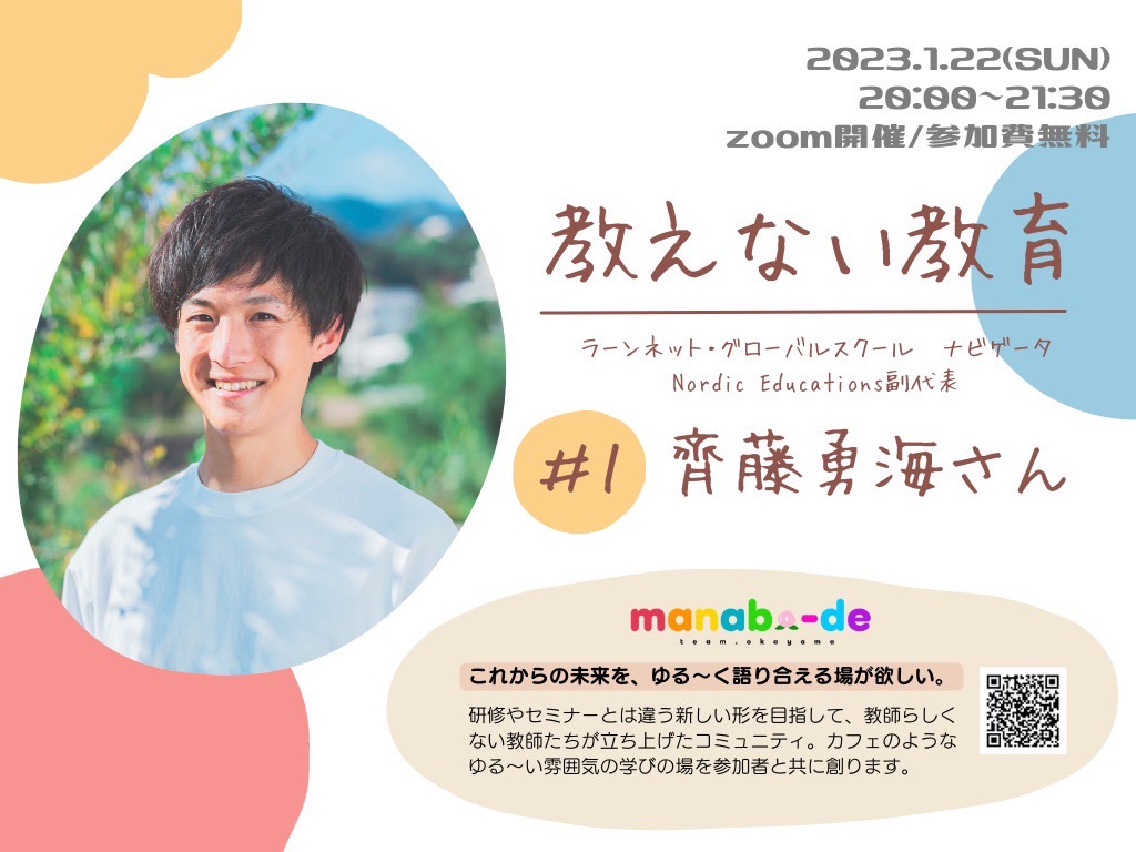 2023年1月22日(日)にラーンネット・グローバルスクール ナビゲータ、Nordic Educations 副代表の齊藤 勇海さんを講師にお招きし、「教えない教育」をテーマにオンライン会を開催しました。